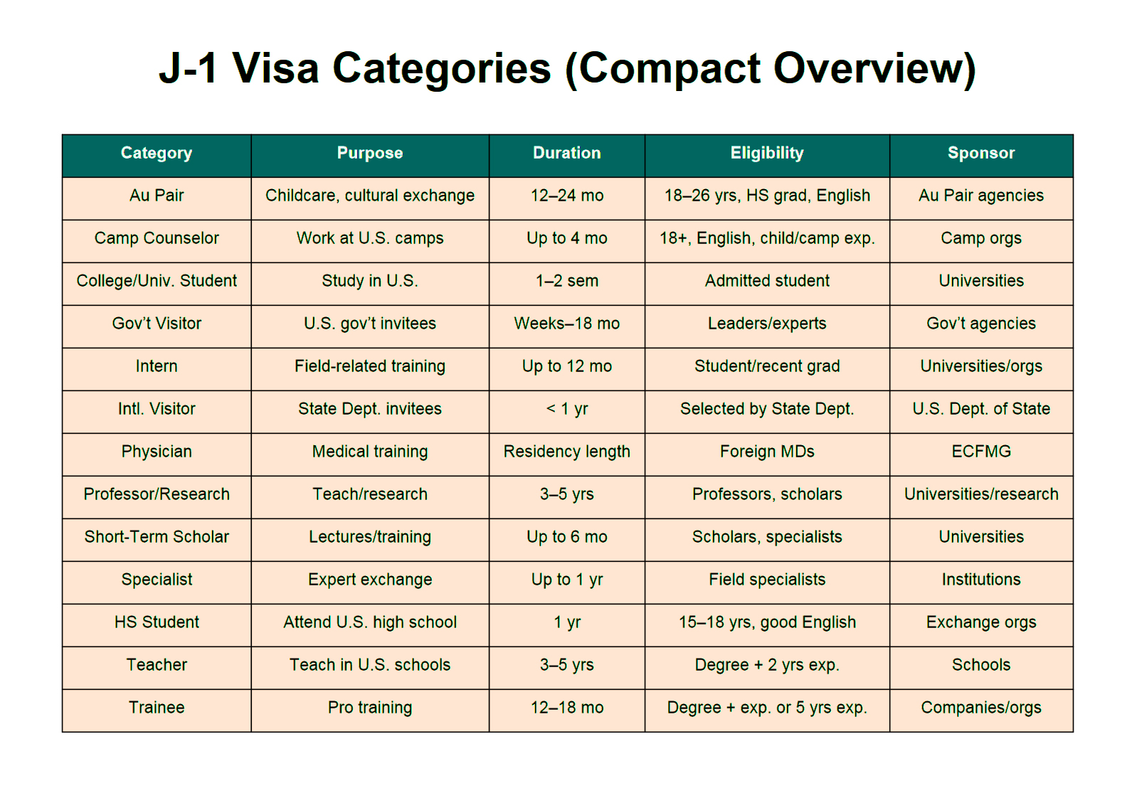 Each J-1 visa requires a designated program sponsor, and the specific activities permitted depend on the category.